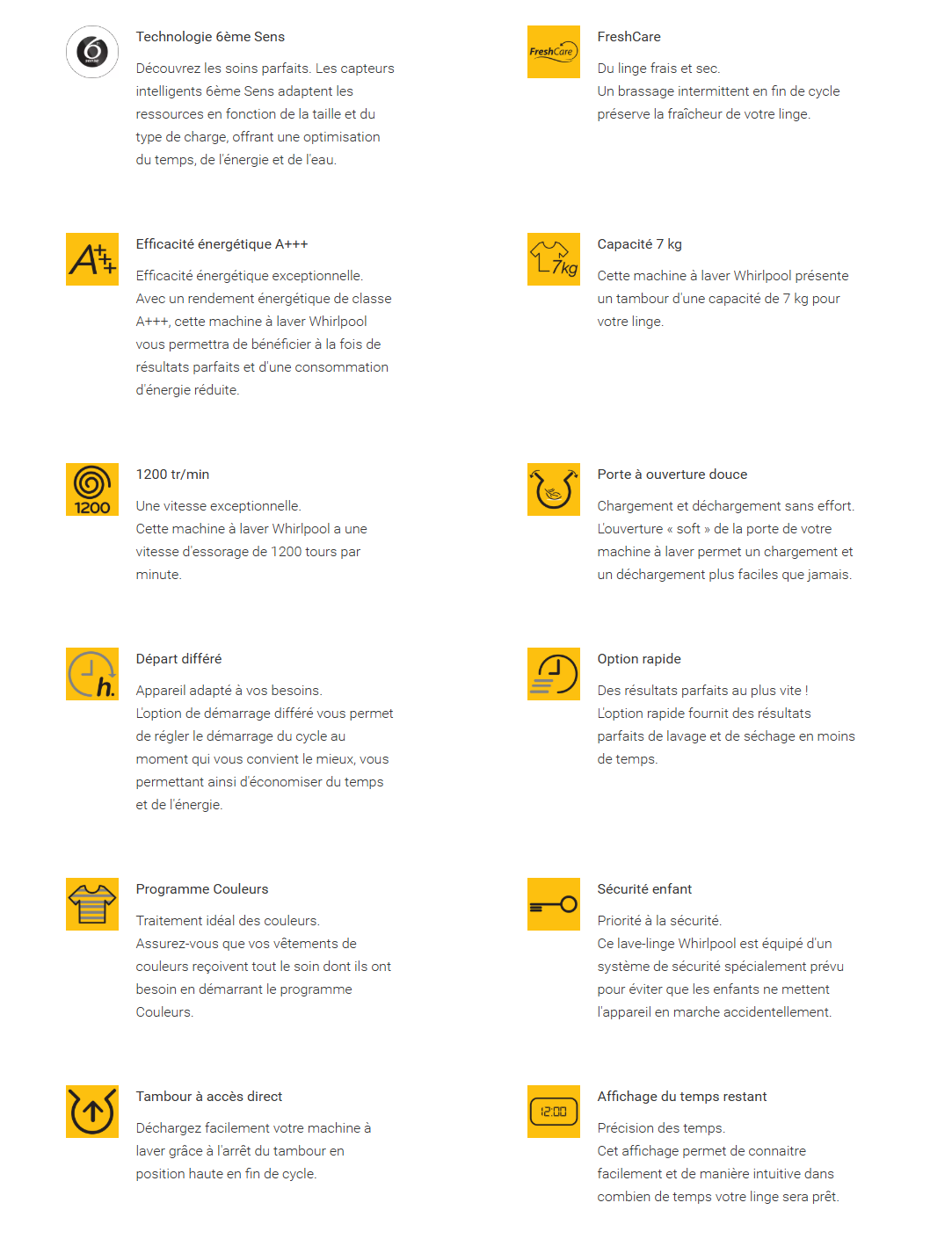 Ce lave-linge posable Whirlpool présente les caractéristiques suivantes : couleur blanche. Grande capacité de 7 kg. Notre appareil de petite largeur est la solution idéale pour les petits espaces. Efficacité des ressources apte à produire une vitesse d'essorage de 1200 tours par minute. Technologie exclusive 6e SENS adaptant les réglages de manière dynamique en fonction de chaque chargement, prenant ainsi un soin tout particulier de votre linge.