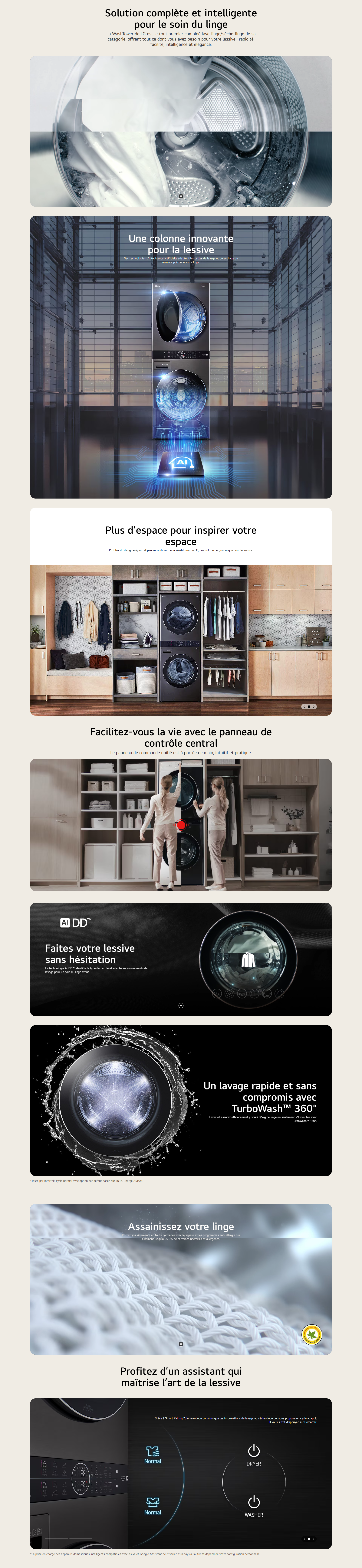 La WashTower de LG est le tout premier combiné lave-linge/sèche-linge de sa catégorie, offrant tout ce dont vous avez besoin pour votre lessive : rapidité, facilité, intelligence et élégance.