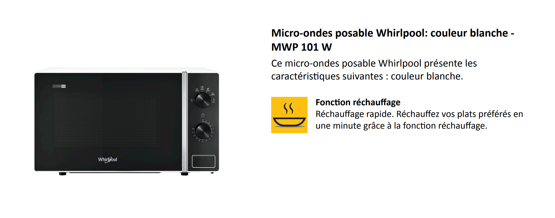 MICRO ONDE WHIRLPOOL POSABLE 20L BLANC