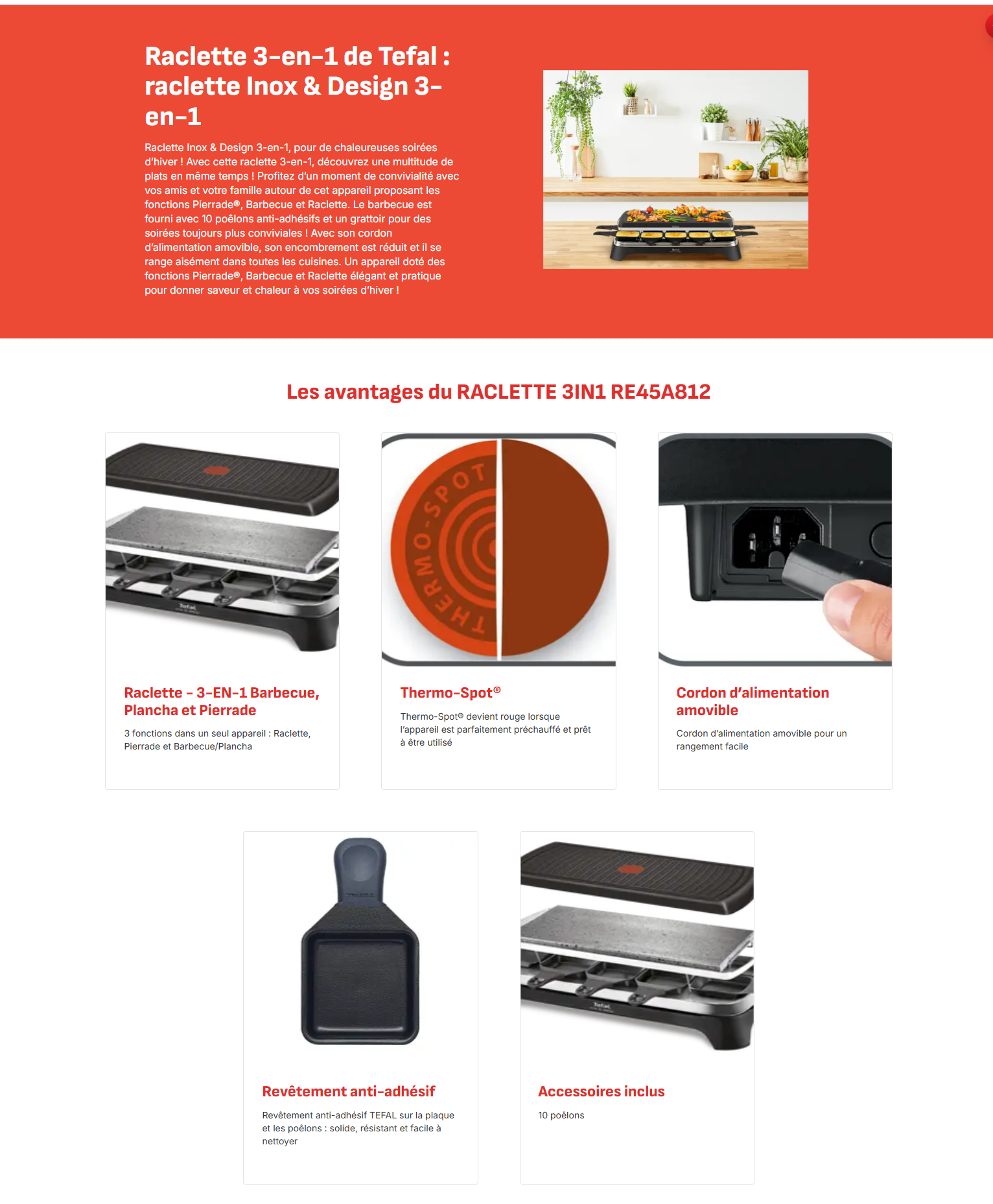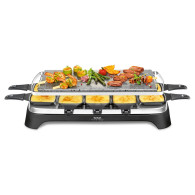 Raclette - 3-EN-1, la cuisine n’a jamais été aussi conviviale ! Doté des fonctions Raclette, Barbecue, Plancha et Pierrade, découvrez un appareil à raclette élégant avec 10 poêlons anti-adhésifs pour des soirées conviviales entre amis ! Très pratique, vous pouvez également l’utiliser comme barbecue. Facile à ranger grâce à son cordon d’alimentation amovible, l’appareil Raclette-Barbecue est aussi très facile à utiliser avec son témoin de chauffe Thermo-Spot® qui devient rouge lorsque l’appareil est chaud et prêt à l’emploi.Un appareil à raclette pratique et élégant pour vos repas en famille ou entre amis.